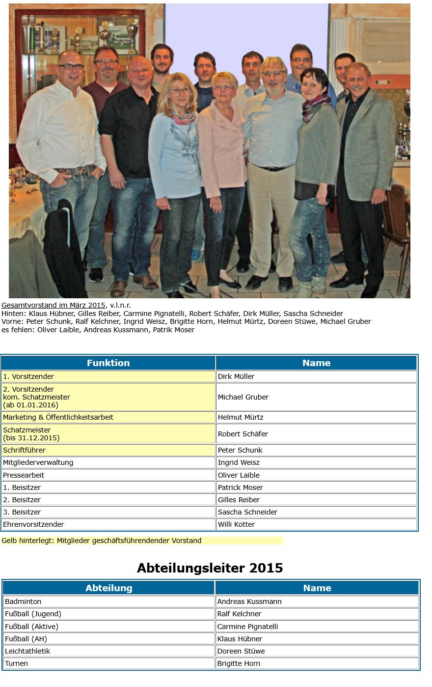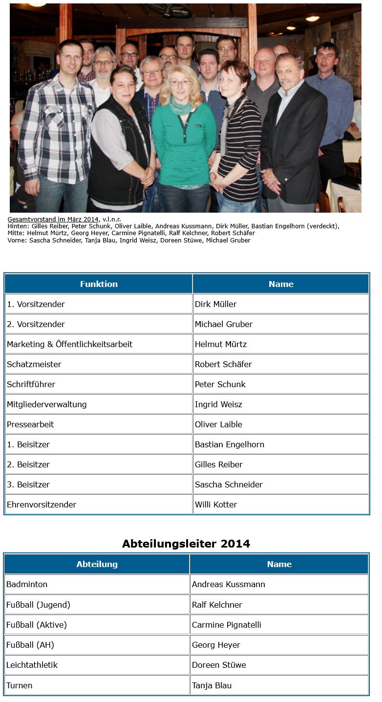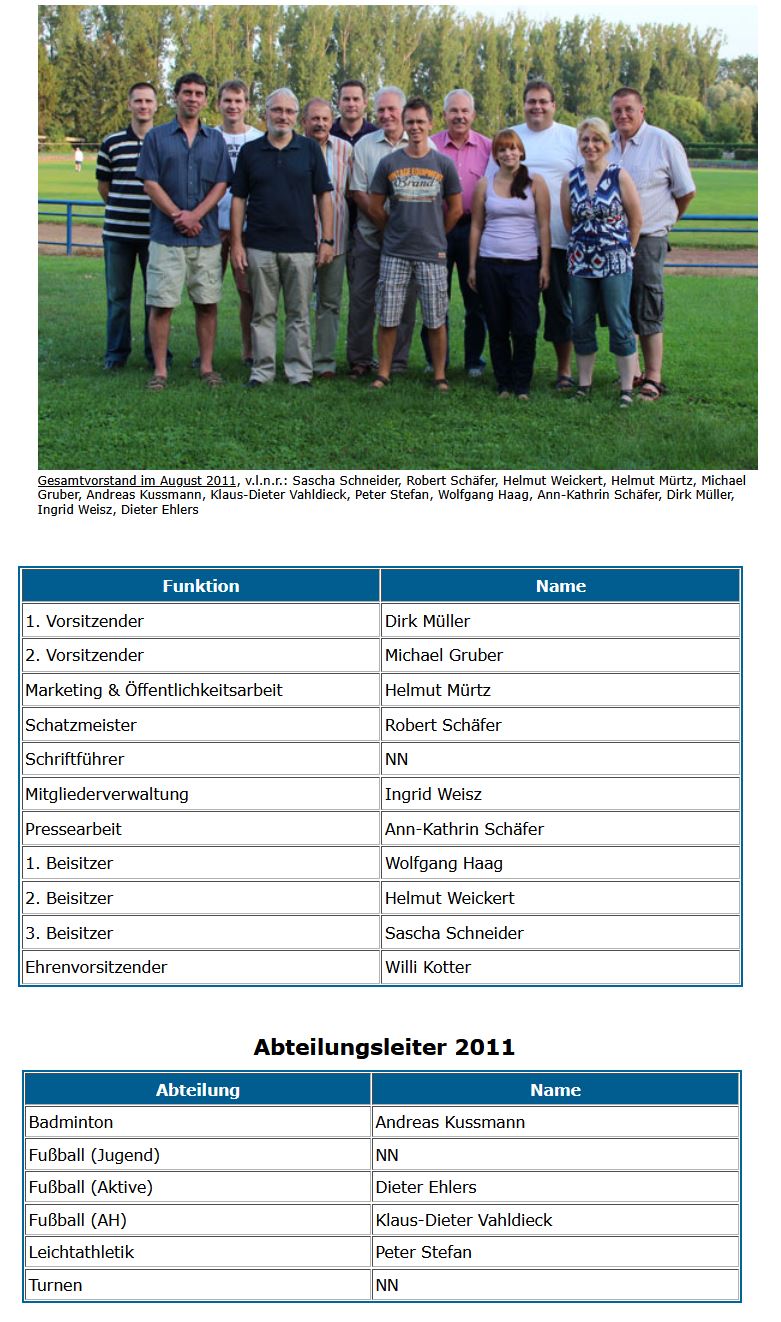 (von links nach rechts): R. Teichgräber (Pressewart), D. Warnecker (Fußball-Aktive), A. Kußmann (Badminton), B. Stärk (Beisitzer), S. Sauer (2. Vorsitzender, Fußball-AH), I. Weisz (Mitgliedsverwaltung), S. Unger (Leichtathletik), P. Schunk (1. Vorsitzender), A. Zeilfelder (Fußball-Jugend), S. Hilgert (Beisitzer), R. Mayer (Schriftführer); nicht auf dem Bild R. Schäfer (Beisitzer)
